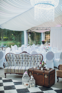 Idealnymi lokalizacjami do takiej ceremonii będą luksusowe rezydencje, eleganckie sale, pałace lub dworki, ale nawet mniej okazałe miejsca można urządzić w stylu glamour. Świetnie sprawdzi się tu połączenie ponadczasowej bieli ze złotem, srebrem i dodatkowym mocnym akcentem, na przykład w kolorze modnej ostatnio marsali, szlachetnej fuksji a nawet czerni. Na stołach powinny znaleźć się eleganckie obrusy, piękne srebra, kryształowe kieliszki i szykowna zastawa. Stoły można przyozdobić kwiatami, na przykład ponadczasowymi bukietami róż. Warto także wykorzystać dekoracyjne dodatki w postaci pereł, teatralnych piór i kryształków.